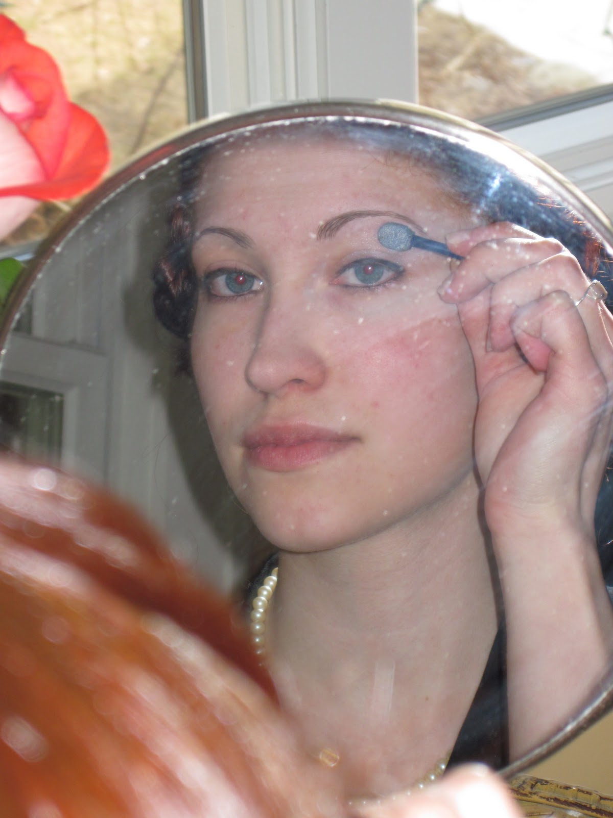The face of the 1930s was smooth, "flawless" skin. Not many of us have truly flawless skin, so you may choose to begin this look with a base of liquid foundation. Personally, I don't care for foundation, and I really don't mind a few flaws here and there. After all, they add character! I begin by applying a powder to a clean, moisturized face. My powder of choice lately is Aubrey Organics Silken Earth, but if you don't mind talc-based powder, I highly recommend Coty's Airspun loose powder. First created in 1935, it is an authentic choice which gives a smooth, almost porcelain look to skin.